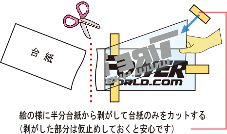 絵の様に固定されていない方を持ち上げて台紙から剥がして台紙のみをカットする。ステッカーを落とさない様に気を付けて下さい。ステッカーのパーツが台紙に付いてきてしまったら、ゆっくりと台紙を少しだけ戻し、付いてきた部分を指で丁寧にこすりアプリケーションに接着するようにしてください。